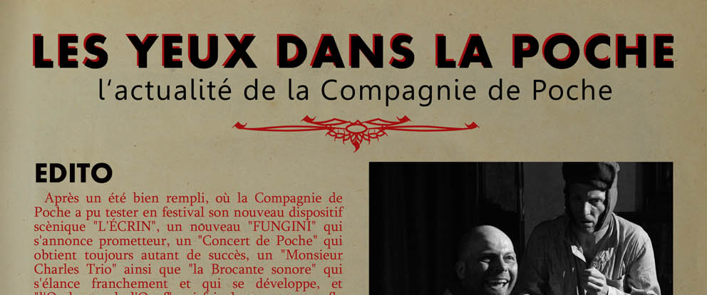 « Les yeux dans la poche » Newletter automne 2011 Le octobre 8, 2011 par ciedepochedans Uncategorized Les nouvelles de la Cie de Poche. À télécharger en entier ou à voir ICI : « les yeux dans la Poche » n°1 Partager :Partager Cliquez pour partager sur Facebook(ouvre dans une nouvelle fenêtre) Facebook J’aime chargement… Similaire