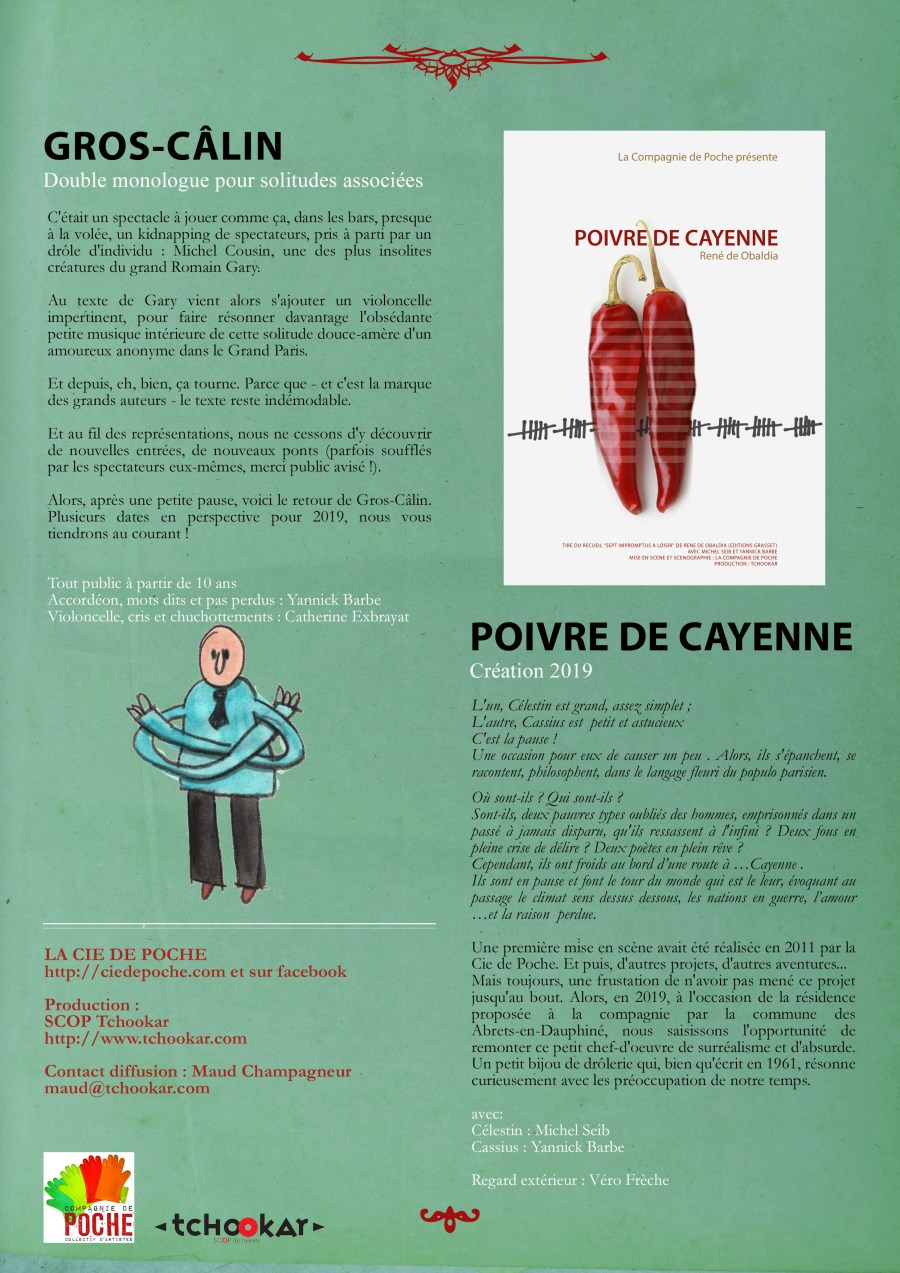 Deux bagnards dans un Cayenne glacial, en pause de leur labeur forcé, qui se racontent et se rêvent. 40 min de plongée dans un texte écrit dans les années 50 et qui sonne comme une actualité d’aujourd’hui. On parle d’éducation, du réchauffement climatique, des hommes, des femmes et du monde en mouvement.